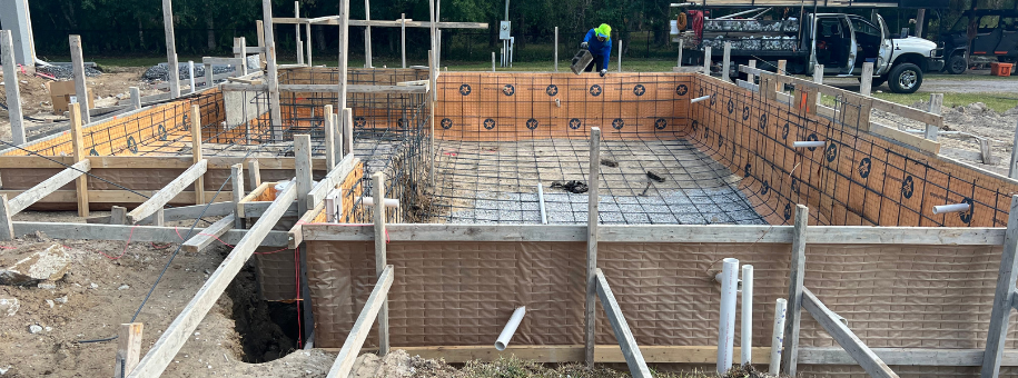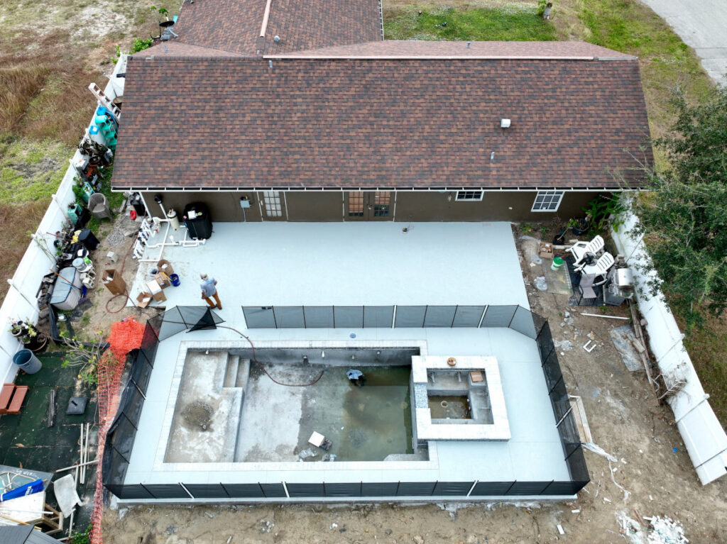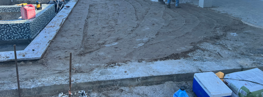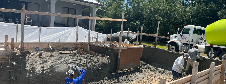 We pour concrete footers around the perimeter and the dedicated pad for pool equipment. This provides stable support for decking (pavers, tile, etc.) and ensures everything is level and built to last in our coastal climate.