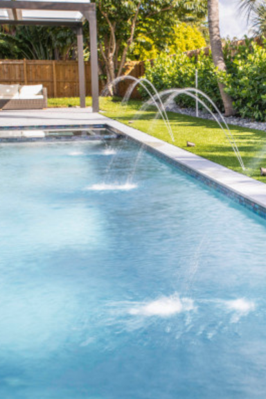 Deck jets create elegant, arching water streams from the pool’s edge—great for visual appeal, gentle noise masking, and cooling mist in Florida heat. Fully customizable in height, angle, and number; controlled via app or switch.